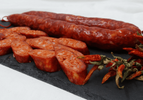 Elaborado de forma tradicional a partir de carnes selectas de nuestra propia matanza y a base de especias naturales. Embutido en tripa natural de cerdo.